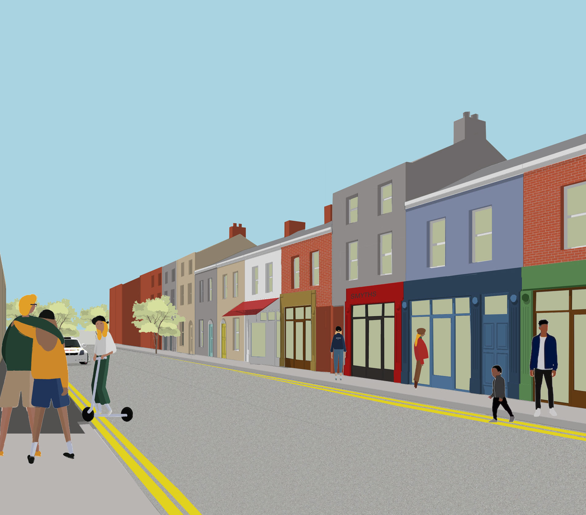 Where a quantity of properties have been earmarked to be refurbished the street, if possible, should be altered by the Local Authority to become one-way for traffic. Removing cars from streets makes them more liveable and pleasant. The street area the removal of one car lane provides should be given over as community external space, which will be much needed for the homes above. This could take the form of small street playgrounds, bike bunkers for secure bike parking, and planting for greenery. Additional space could be given out to any restaurants and cafes.
