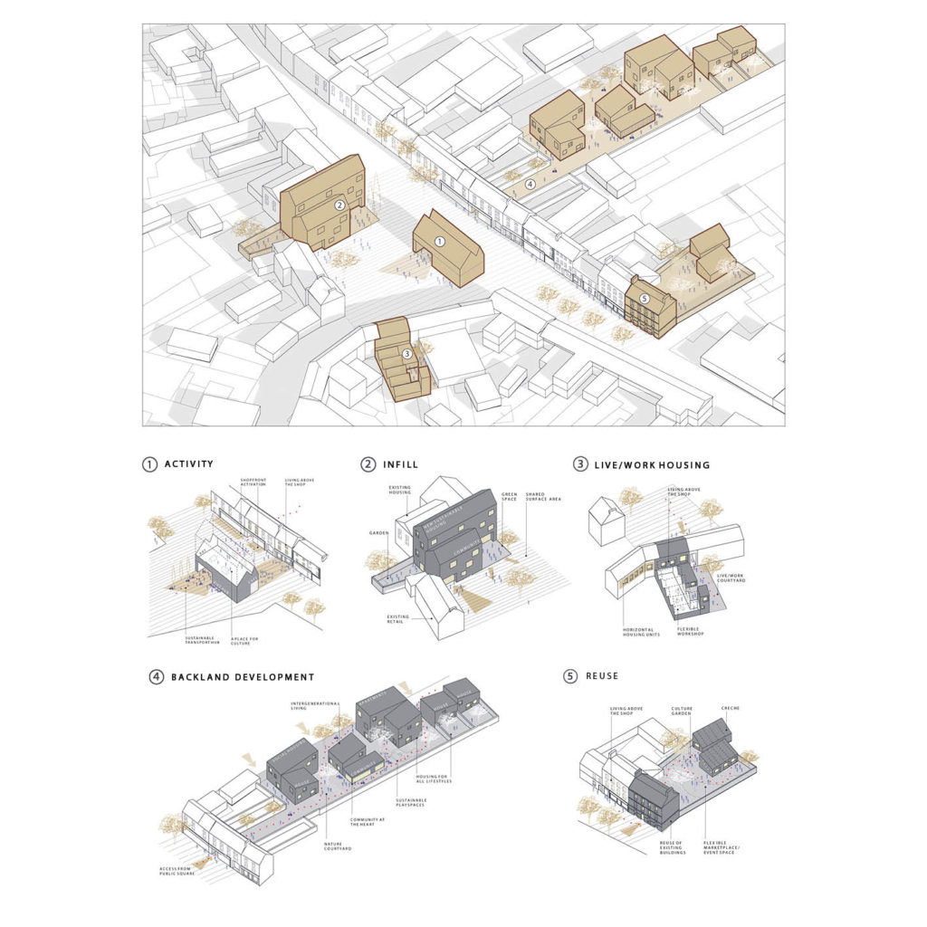 Housing, the perfect use for vacancy of upper floors and extending into the backlands behind main streets, can make for interesting interlocking sites and atmospheric spaces. These new models of housing suit inter-generational living and working from home. People choose what housing model best suits their lifestyle, and it could be done at a reasonable cost by using what we already have and making it brilliant for now and for the future.