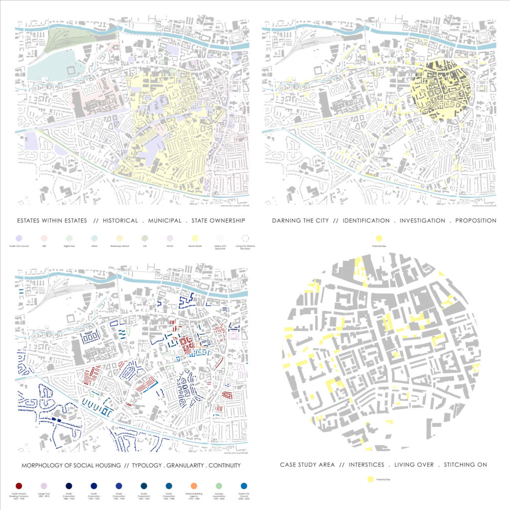 The neighbourhood situated on the fringes of the historic core of Dublin has been selected for its varied pattern of settlement and evolving use and demographics, the consequent layering of infrastructure and variety of living environments and housing/building types within a relatively low-rise but densely occupied urban context; a range of conditions and opportunities that may be seen as typical of Irish urban situations of different scales.