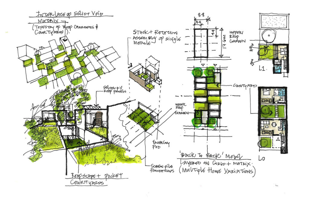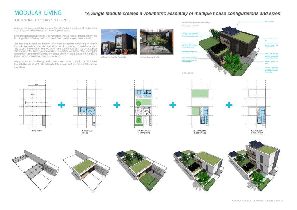 Our concept is based on a simple matrix and a fixed grid that utilises a singular, repetitive 3-D volumetric timber module to generate a variety of 1, 2, 3 and 4-bedroom homes through a process of stacking and rotation. The interlocking volumes create a solid and void interlace providing in between pockets of outdoor rooms in the form of courtyards and upper roof gardens. The system can produce at scale and to more sustainable densities.