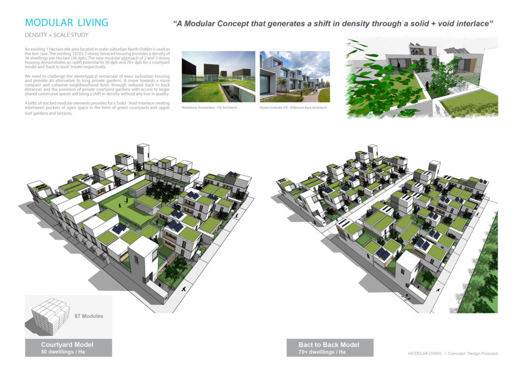 Using our matrix of this compact Low Rise – Medium Density housing model, if eighty-seven identical factory-built timber modules were produced they could potentially generate a courtyard block at a density of 50 dwellings per hectare, while a typical back-to-back model could achieve in excess of 70 dwellings per hectare.