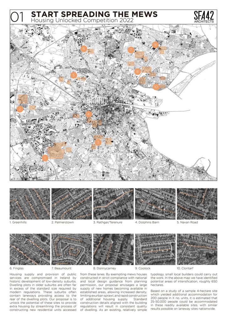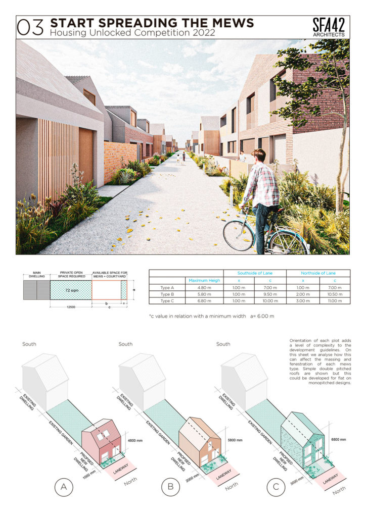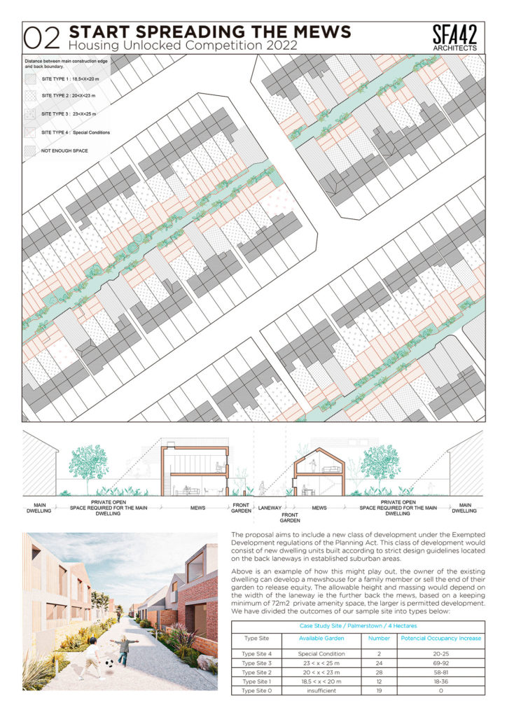 Our proposal is to unlock the potential of these areas to provide extra housing by identifying and analysing suburban laneways in order to establish design guidelines which would streamline the process of construction of new residential units, accessed from these lanes. By exempting mews houses (constructed in strict compliance with national design guidance) from requiring planning permission, the proposal envisages a large supply of homes becoming available in established areas. In turn this allows for increased density, limits urban sprawl, and facilitates rapid construction of additional housing.