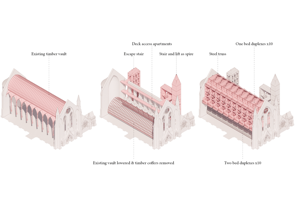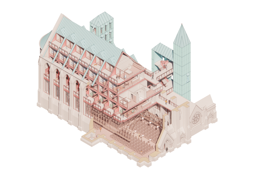 We have only explored the potential of one church for this proposal, which can produce 10 1-bed and 10 2-bed duplex apartments to accommodate homes for up to 60 people with a functioning worship space below. If we consider the remaining 32 churches identified in the Archdiocese’s submission, all of which would require site-specific proposals, an additional 18.5 hectares is available for the delivery of housing. The untapped potential of church sites to deliver housing is clearly evident.
